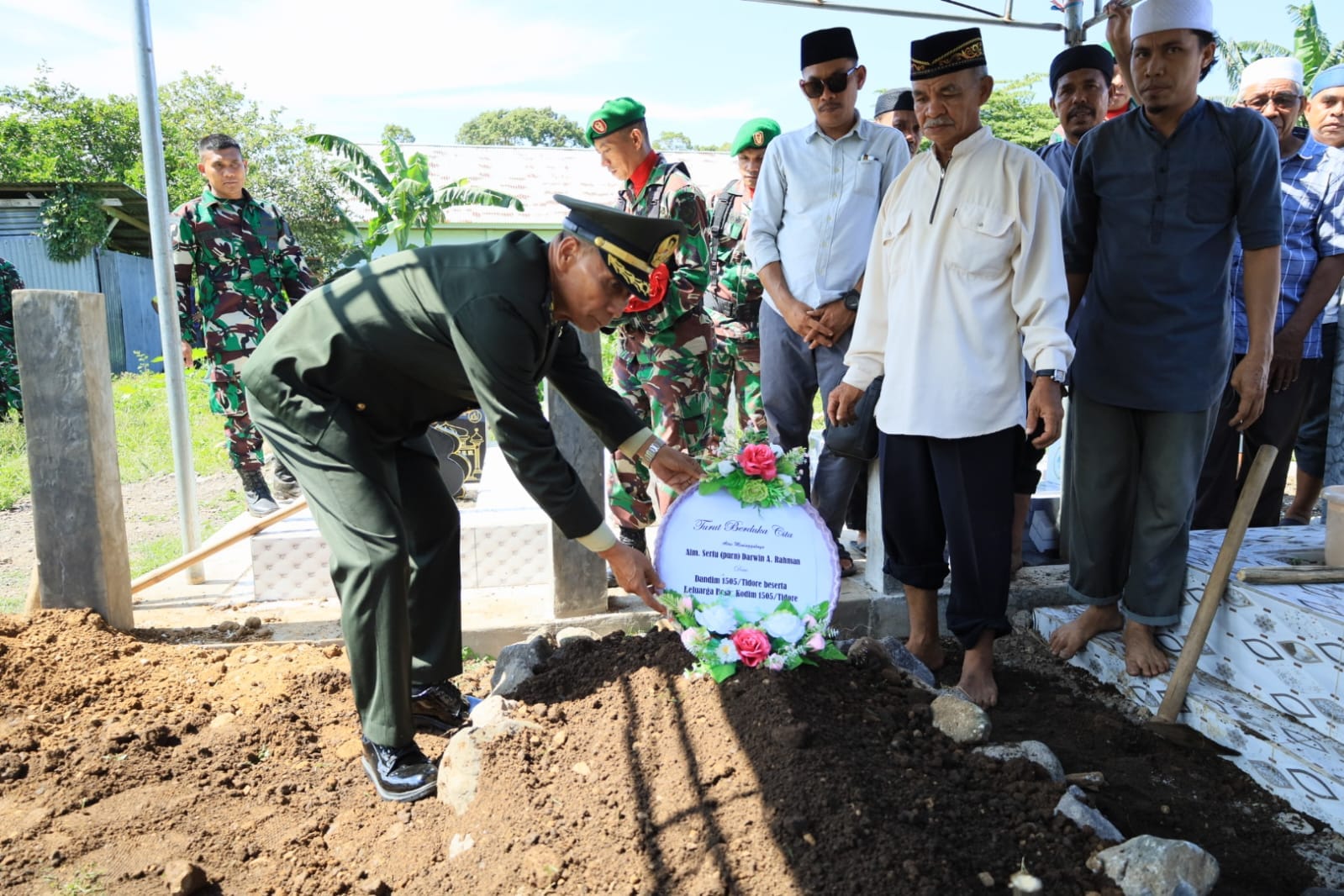 Selanjutnya, prosesi pemakaman militer berlangsung dengan khidmat di Tempat Pemakaman Umum (TPU) Kelurahan Dowora. Bertindak sebagai Inspektur Upacara (Irup) adalah Kasdim 1505/Tidore Mayor Inf Asihno, Perwira Upacara (Pa Up) Letda Inf Gafur, serta Komandan Upacara (Danup) Pasi Intel Kodim 1505/Tidore Letda Inf Iskandar Sabtu.