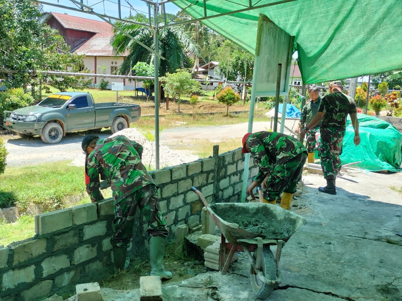 Pengerjaan pagar mushola dilakukan secara gotong royong antara personel TNI dan warga setempat. Mulai dari penyiapan material hingga penyusunan batako, seluruh proses berjalan dengan penuh semangat kebersamaan di lapangan.